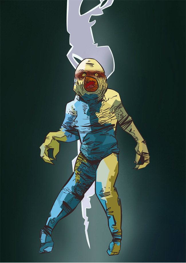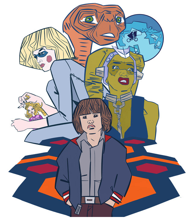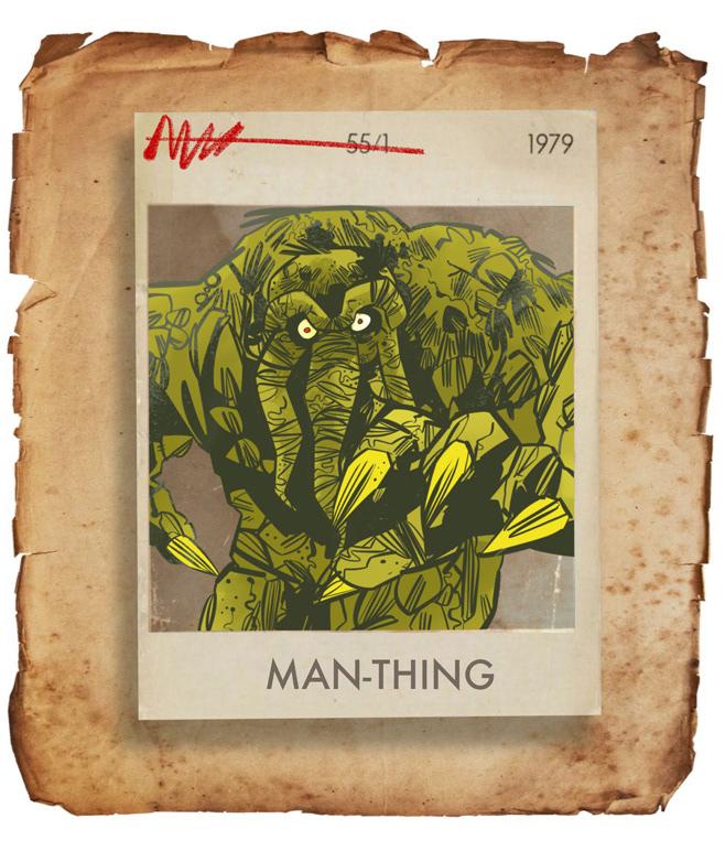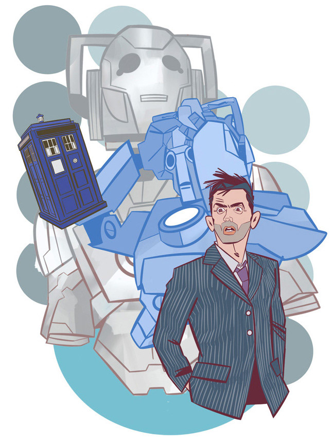 Illustrations with the emphasis on film, television, and comic-strip culture. From top to bottom: 10th Doctor [Dr.Who]; 80's Film Icons 1, 80's Film Icons 2, Flukeman [X-Files]; Man-Thing [Marvel/Disney Plus]; The Monster; Spider-man x2.