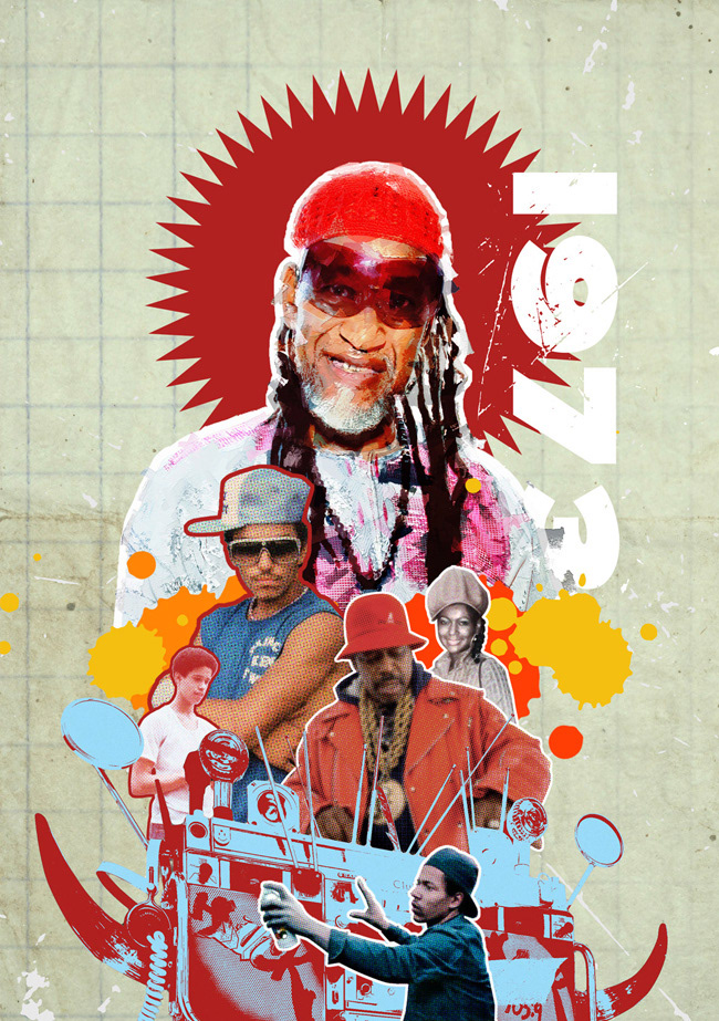 A series of digital collage illustrations celebrating the architects of Hip-Hop culture. From top to bottom: The Birth Of Hip-Hop Culture [Kool Herc, Sylvia Robinson, Grand Master Caz, Dondi White, the Rock Steady Crew]; Kurtis Blow, and LL Cool J.