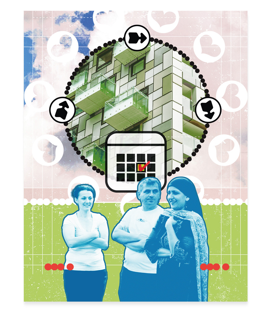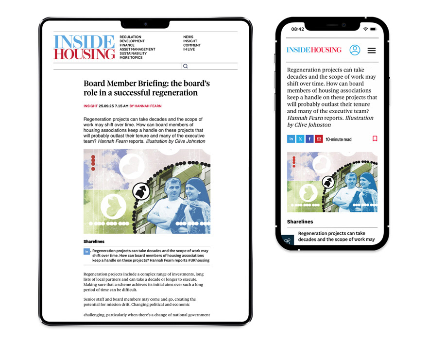 A series of collage illustrations I created for Inside Housing, a monthly trade publication that covers the United Kingdom’s social housing sector. Regeneration projects can take decades and the scope of work may shift over time. How can board members of housing associations keep a handle on these projects that will probably outlast their tenure and many of the executive team?